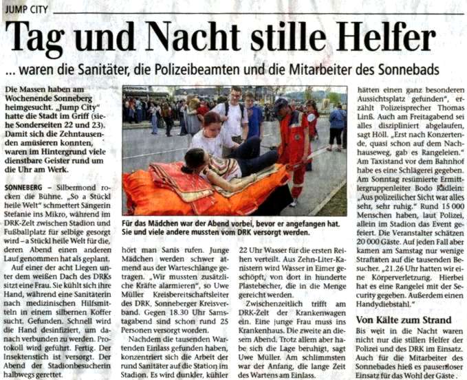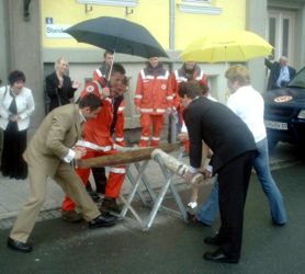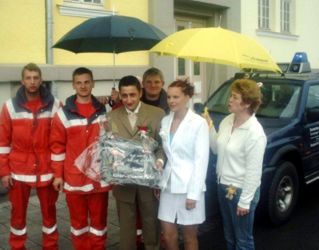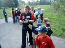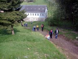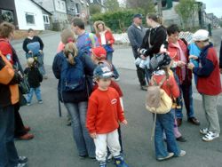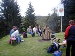 35 Wanderfreudige trafen sich Punkt 15.00 Uhr am Kindergarten und los zog ein lustiger Trupp in Richtung Rennsteig. Auch der Wettergott spielte dabei mit und so sollten unsere mitgenommenen Regenschirme nur als Wanderstöcke dienen. An der Limbacher Greiner-Gruft war die Aufregung groß: fanden die Kinder da doch wirklich ein "Bonbonnest" in einem Papierkorb. Dies sollte eine kleine Belohnung für unsere Kinder sein, denn bis hierhin hatte noch kein kleiner Wanderer gejammert, weil der Weg zu weit war. Wir Eltern waren darüber eigentlich ganz schön erstaunt, denn bei Spaziergängen anderer Art ist die Quengelei immer riesig groß. Es zeigt sich also, in einer Gemeinschaft zu wandern bringt auch unseren Kindern mehr Spaß. Und weiter ging es durch den Wald, das Gläserstal entlang nach Scheibe-Alsbach zur Bergwachthütte. Einige Muttis und Vatis von uns hatten sich auf Bratwurstbraten und Getränkeverkauf eingestellt. Doch die Überraschung beim Eintreffen an der Hütte der Bergwacht Scheibe-Alsbach war groß: überall standen Kameraden der Bergwacht und leisteten ihren Einsatz, so das alle Gummibäreneltern an diesem schönen Tag nicht "arbeiten" mußten. Sogar ein richtiges Lagerfeuer hatten sie für uns aufgeschichtet. Alles klappte wie am Schnürchen. Nur ein Vati hatte früh seine Arbeit verrichtet: unser Bäcker Jens von der Bäckerei "Anton" spendierte uns Semmeln und die frischen Brote. Vielen Dank!